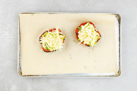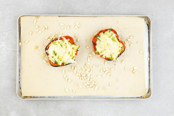 Die Paprika aus dem Ofen nehmen, jeweils mit dem Stamppot befüllen und mit dem restlichen Käse bestreuen. Zurück in den Ofen geben und 5–8Min. überbacken, bis der Käse goldbraun und geschmolzen ist.