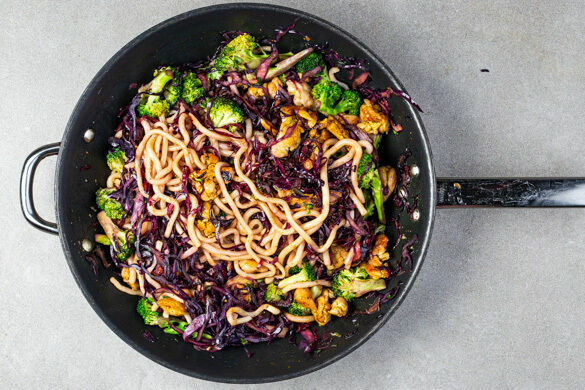 Udon – das sind extra dicke Weizennudeln, die in ihrer Heimat Japan als Comfortfood geliebt werden. Ein wohliges Gefühl wird sich heute auch in deinem Bauch ausbreiten, wenn du die Nudeln in der aromatischen Sauce mit angebratenem Rotkohl, Brokkoli und feinem Hähnchenschenkelfleisch genießt. Dazu gibt es selbst eingelegten Ingwer: eine kleine, pikante Erfrischung für deine Geschmacksknospen. Oishii, also richtig lecker!