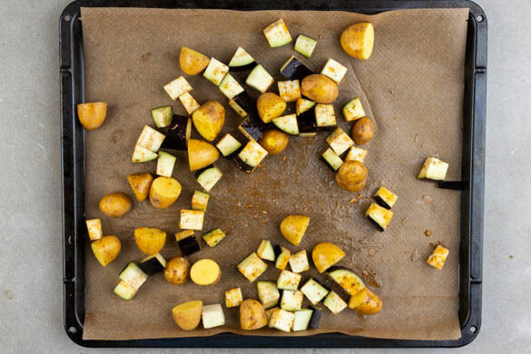 Die Auberginen in ca. 2cm große Würfel schneiden. Die Kartoffeln samt Schale je nach Größe halbieren oder vierteln.