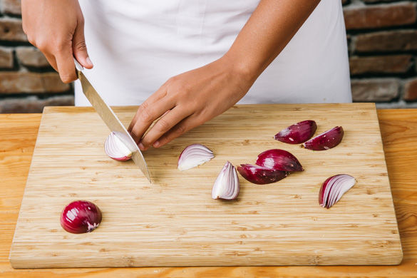 Den Umluftbackofen auf 220°C vorheizen. Die Zwiebeln schälen und in ca. 6 Spalten schneiden.