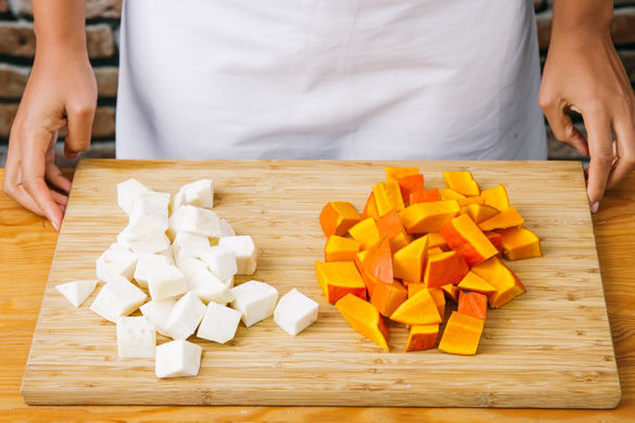 Den Knollensellerie schälen und mit dem Kürbis in ca. 1-2cm große Stücke schneiden.