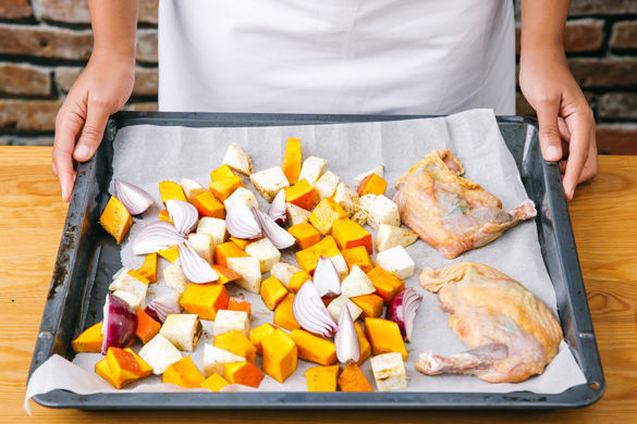 Das Perlhuhn mit dem dem gewürzten Gemüse auf ein mit Backpapier ausgelegtes Backblech legen und für ca. 20-25Min. im Ofen garen. Garprobe: Mit einem Messer in das Fleisch einstechen. Läuft klarer Fleischsaft heraus, ist das Stück gar.