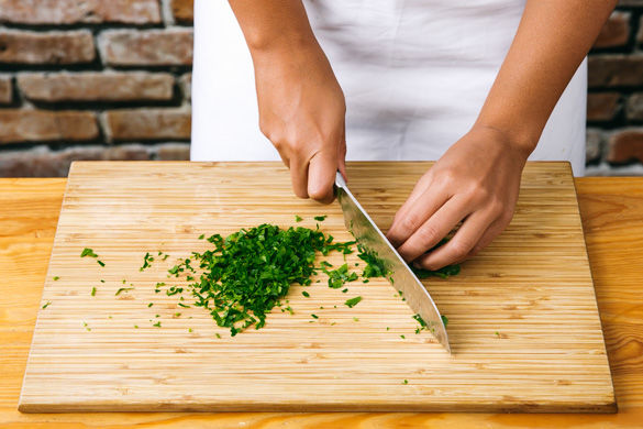 Zum Schluss die Petersilie fein hacken und damit das Ofengemüse und Perlhuhn garniert servieren.