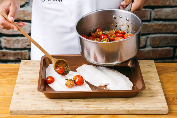 Die Fischfilets in einer Auflaufform leicht salzen. Die Tomatenbutter drüber geben und für ca. 10-15Min. im Ofen fertig garen. Vorsicht! Seelachsfilets können Gräten besitzen. Diese am besten mit einer Pinzette herausziehen. Ansonsten einfach beim Essen auf die Gräten achten.