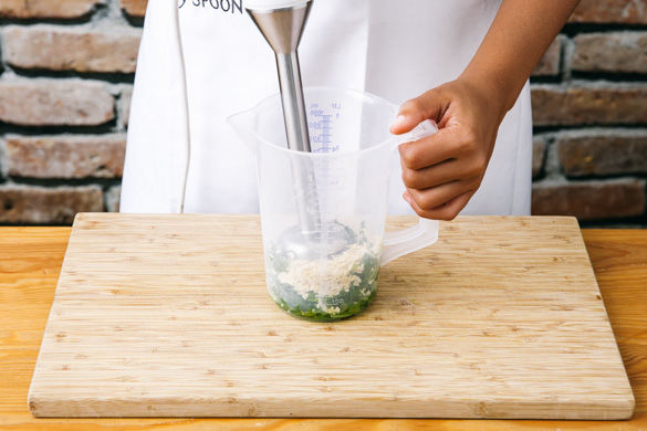 Inzwischen 2/3 des Rucolas grob hacken und mit den Mandeln und 2-3EL Olivenöl in einem hohen Gefäß cremig pürieren, mit etwas Salz und Pfeffer abschmecken.