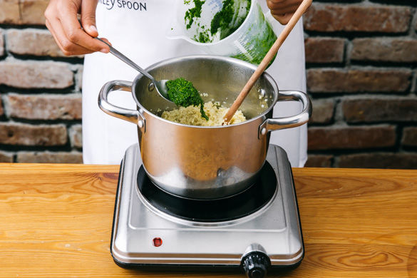 In der Zwischenzeit 300ml Wasser in einem Wasserkocher aufkochen und mit dem Brühwürfel in einen mittleren Topf geben, 150g des Bulgurs einrieseln lassen. Zugedeckt für ca. 8-10Min. bei niedriger Temperatur garen. Tipp: Wer großen Hunger hat, kann den ganzen Bulgur verwenden.
