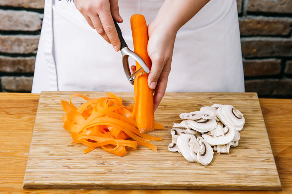 Inzwischen die Champignons mit etwas Küchenkrepp oder einer Bürste von evtl. Schmutz befreien und in feine Scheiben schneiden. Die Karotten schälen und mit einem Sparschäler längs feine, dünne Streifen abschälen.