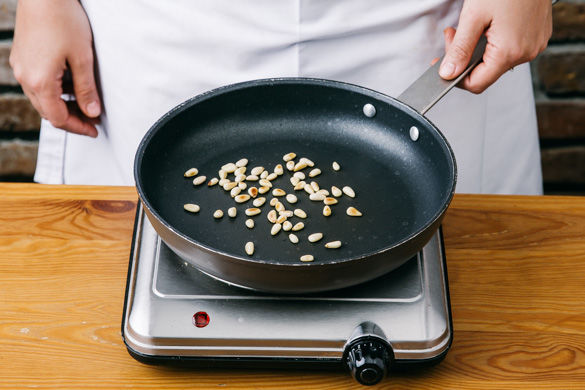 Die Pinienkerne in einer kleinen Pfanne auf mittlerer Hitze ohne Öl goldbraun anrösten, bis sie leicht anfangen zu duften. Vorsicht! Die Pinienkerne können schnell anbrennen!