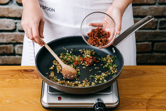Die Pinienkerne in einer kleinen Pfanne auf mittlerer Hitze ohne Öl goldbraun anrösten, bis sie leicht anfangen zu duften. Vorsicht! Die Pinienkerne können schnell anbrennen!