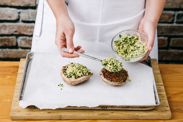 Die Portobello-Pilze mit dem Deckel nach unten auf ein mit Backpapier ausgelegtes Backblech legen und erst gleichmäßig mit der Pilz-Tomaten-Mischung füllen, dann mit dem Mandelmix bestreuen und für ca. 8-15min. im Ofen goldbraun backen.