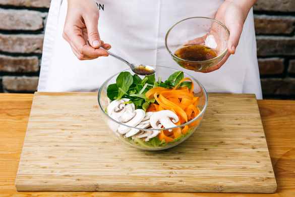 Aus 1-2EL Olivenöl, 1-2EL Essig, 1 Prise Zucker, Salz und Pfeffer eine leichte Vinaigrette mischen. Die Champignons mit den Karottenschleifen und dem Salat sowie Vinaigrette mischen. Salat garniert mit Pinienkernen, restlicher Petersilie und gerösteten Portobello-Pilzen servieren.