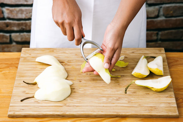 Die Birnen vierteln, vom Kerngehäuse befreien und mit dem Messer oder Sparschäler schälen. Größere Birnen in feine Spalten schneiden.