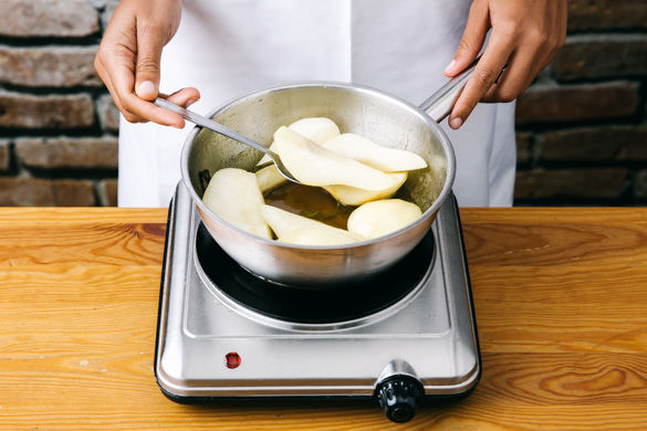 Die Birnen in den Sirup geben und weitere ca. 2-3Min. darin bei niedriger Hitze garen. Den Topf vom Herd nehmen und die Birnen im Sirup ziehen lassen.