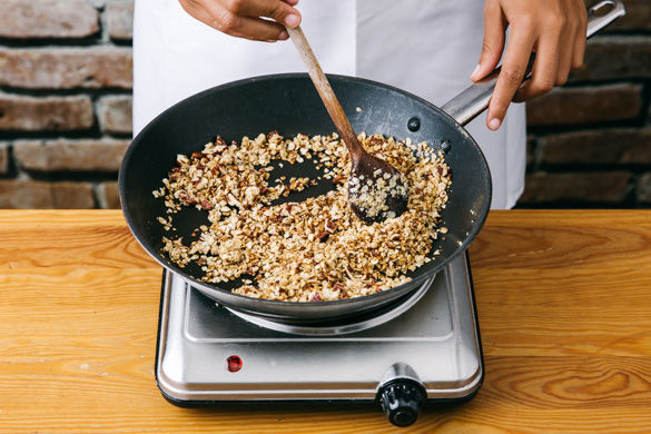 In der Zwischenzeit die Nüsse grob hacken. Die Butter in einer mittelgroßen Pfanne schmelzen und die Haferflocken zusammen mit den Nüssen und 1/2TL Salz und 2-3EL des Honigsirups in der Pfanne vermischen und ca. 2-3Min. bei mittlerer Hitze goldbraun rösten. Anschließend abkühlen lassen.