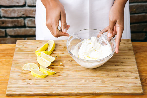 Die Zitronenschale abreiben und mit dem Ricotta cremig verrühren. Die restliche Zitrone in Spalten schneiden.
