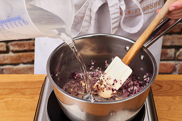 Die Zwiebel schälen und eine Hälfte in feine Würfel schneiden. Die zweite Hälfte beiseitelegen. In einem großen Topf 1–2EL Olivenöl erhitzen und die Zwiebelwürfel darin ca. 1–3Min. glasig dünsten. Den Senf und den Brühwürfel unterrühren, mit 1L Wasser aufgießen und aufkochen lassen.