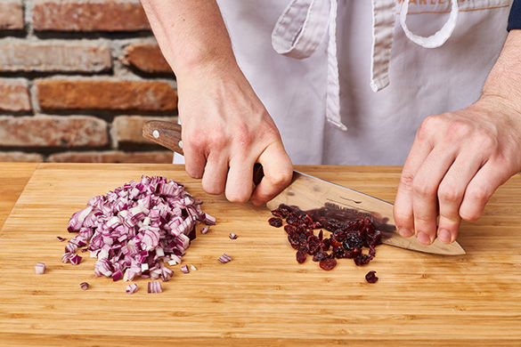 Für das Relish die zweite Zwiebelhälfte in feine Würfel schneiden. Die getrockneten Cranberrys grob hacken.