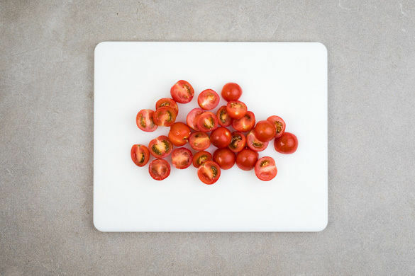 Die Kirschtomaten halbieren. Die Pasta in das kochende Wasser geben und in 6–8Min. bissfest kochen. Mit einem Messbecher 100ml Pastawasser abschöpfen, dann die Pasta in ein Sieb abgießen, abtropfen lassen, zurück in den Topf geben und warm stellen.