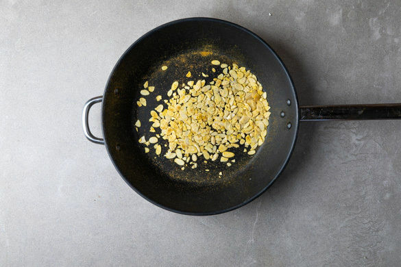 Die Mandeln mit der Gewürzmischung in einer großen Pfanne ohne Zugabe von Fett bei mittlerer Hitze 1–2Min. goldbraun anrösten. Vorsicht, sie können schnell zu dunkel werden. Zum Abkühlen aus der Pfanne nehmen und beiseitestellen.