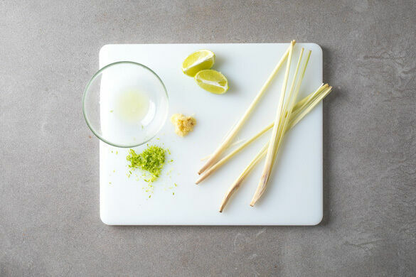 In einem mittelgroßen Topf ausreichend leicht gesalzenes Wasser für die Nudeln zum Kochen bringen. Die Zitronengrasstange längs vierteln. Den Knoblauch schälen und fein würfeln. Die Limettenschale abreiben und die Limette halbieren, eine Hälfte auspressen, die andere Hälfte in Spalten schneiden.