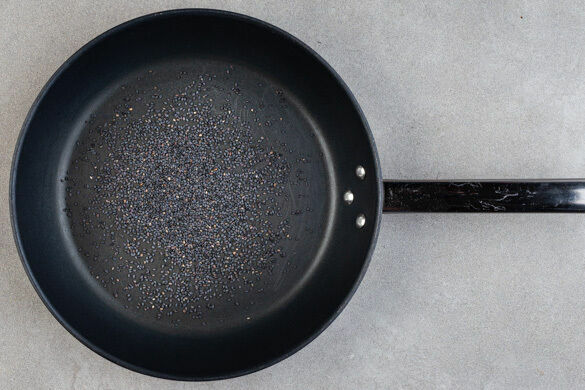 Den Sesam in einer mittelgroßen Pfanne bei mittlerer Hitze 2–3Min. anrösten, bis er duftet. Zum Abkühlen auf einem Teller beiseitestellen. Die Pfanne aufbewahren.