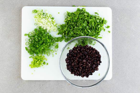 Die Bohnen mit den weißen Lauchzwiebeln, dem Spinat, der Chilischote nach Belieben, dem Mais und ca. ⅔ des Käses vermengen. Die Füllung mit ½TL Salz und 1 kräftigen Prise Pfeffer würzen.