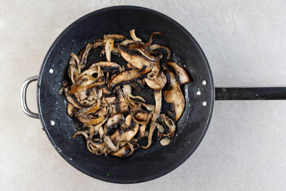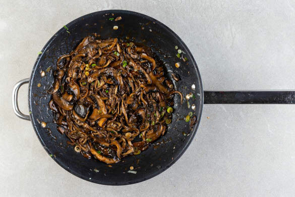 Die Austernpilze in dünne Streifen reißen. Die Portobello-Pilze in lange, dünne Streifen schneiden. Die Lauchzwiebeln in feine Ringe schneiden, den weißen und grünen Teil trennen. Die Pilze und die weißen Lauchzwiebeln in einer großen Pfanne mit 2EL Pflanzenöl, dem Paprikapulver und ca. 1/2TL Salz bei starker Hitze 10–12Min. knusprig-braun anbraten.