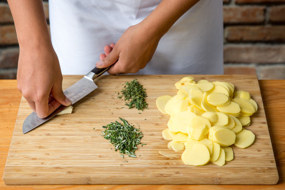 Den Backofen auf 220°C Umluft oder 230°C Ober-/Unterhitze vorheizen. Die Kartoffeln mit einem Sparschäler schälen und in ca. 0,5cm dünne Scheiben schneiden. Den Thymian und Rosmarin vom Stängel streifen und grob hacken. Den Knoblauch schälen und mit einem Messer flach zerdrücken.