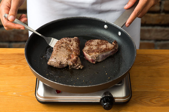 In einer mittleren Pfanne 1-2EL Olivenöl erhitzen, die Steaks mit Salz und Pfeffer würzen und von jeder Seite ca. 1-2Min. scharf anbraten, dann auf einen Teller legen und warm halten. Die Pfanne nicht auswischen.