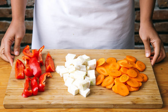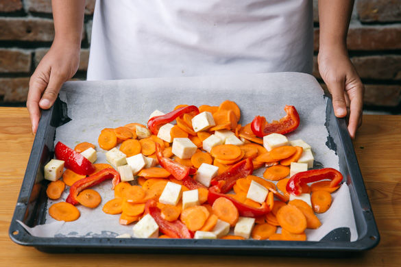 Den Backofen auf 230°C Umluft oder 250°C Ober-/Unterhitze vorheizen. Den Sellerie schälen und in ca. 1–2cm große Würfel schneiden. Die Karotten schälen und in schräge Scheiben schneiden. Die Paprika vierteln, entkernen und in ca. 2–3cm dicke Streifen schneiden.