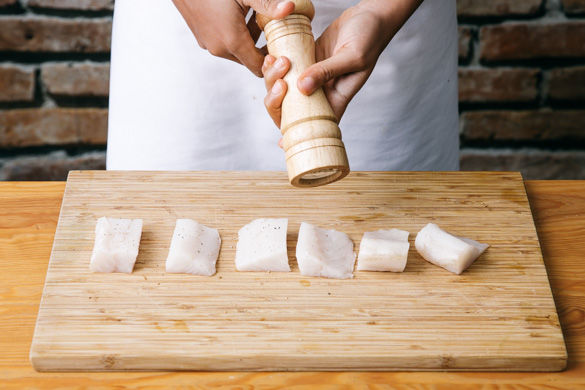Währenddessen die Seelachsfilets in gleich große Stücke schneiden und mit Salz und Pfeffer würzen. Vorsicht! Der Fisch kann Gräten besitzen. Diese am besten mit einer Pinzette herausziehen. Ansonsten einfach beim Essen auf die Gräten achten.