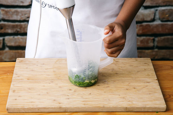 Die Petersilienstängel, ca. 2/3 der Petersilienblätter, den Knoblauch, die 1/2 der Kapern und 2–3EL Olivenöl mit einem Stabmixer in einem hohen Gefäß fein pürieren. Mit ca. 1EL Essig, Salz und Pfeffer abschmecken.
