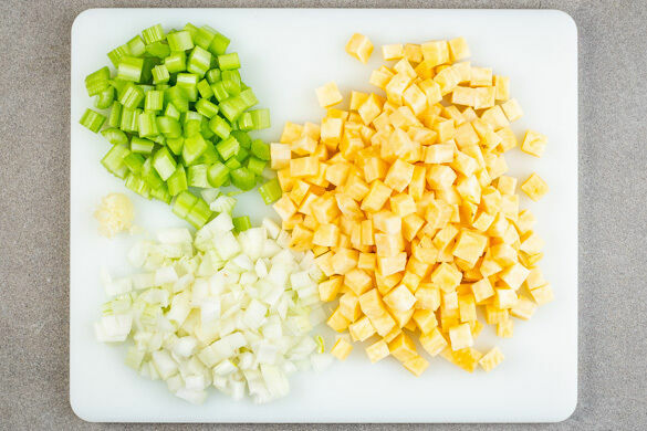 Den Backofen auf 240°C (220°C Umluft) vorheizen. In einem Wasserkocher 1,7L Wasser aufkochen. Den Knollensellerie schälen und in 1–2cm kleine Würfel schneiden. Den Stangensellerie in kleine Würfel schneiden. Die Zwiebeln schälen und grob würfeln. Den Knoblauch schälen und fein würfeln.