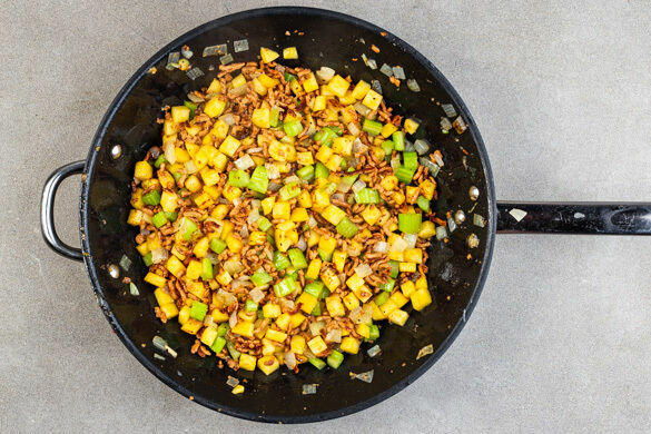 Das vegane Hack in einer großen Pfanne mit 2EL Pflanzenöl bei starker Hitze ca. 2Min. krümelig anbraten. Den Knollensellerie , den Stangenellerie und die Zwiebeln zugeben und 5–10Min. braten, bis die Knollenselleriewürfel fast gar sind.