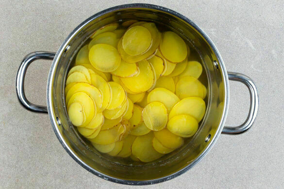 Die Kartoffeln samt Schale in 2–3mm dünne Scheiben schneiden und in einem großen Topf mit 1L kochendem Wasser begießen, bis sie gerade bedeckt sind. 1 kräftige Prise Salz zugeben und 5–8Min. abgedeckt bei starker Hitze köcheln, bis die Kartoffeln leicht glasig sind. Abgießen. Die Rosmarinnadelnf von den Stängeln streifen und mit der Petersilie samt Stängeln fein hacken.