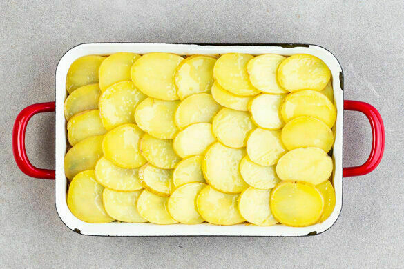 Die Gemüse-Hack-Sauce in einer Auflaufform verteilen und gleichmäßig und leicht überlappend mit den Kartoffeln bedecken. Mit 1EL Pflanzenöl beträufeln oder vegane Butter in kleinen Flöckchen auf den Kartoffeln verteilen und mit 1 Prise Salz würzen. Im Ofen ca. 15Min. backen, bis die Kartoffeln goldbraun und knusprig sind.