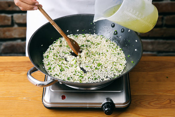 In einer großen, tiefen Pfanne den Knoblauch, den Thymian, die Petersilienstängel und den Reis in 1EL Olivenöl ca. 1Min. auf mittlerer Hitze anschwitzen. Mit Verjus und Steinpilzbrühe ablöschen und mit Salz und Pfeffer würzen. Nach und nach unter Rühren die Brühe hinzufügen und einkochen lassen, bis der Reis bissfest und sämig ist, das dauert ca. 18–20Min.
