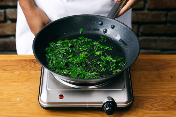 In einer zweiten Pfanne 1–2EL Olivenöl mittelhoch erhitzen und die Petersilienblätter darin kurz knusprig anbraten. Sobald die Petersilie anfängt, sich zu verfärben, aus der Pfanne nehmen und überschüssiges Fett auf etwas Küchenkrepp abtropfen lassen.