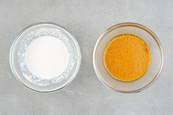 D ½ der Knoblauch-Ingwer-Paste mit 6EL veganer Mayonnaise, 1EL hellem Essig und ½TL Salz zu einem Dip verrühren. Die Misopaste, die restliche Knoblauch-Ingwer-Paste sowie 2EL hellen Essig und 150ml Wasser zu einer Sauce verrühren.