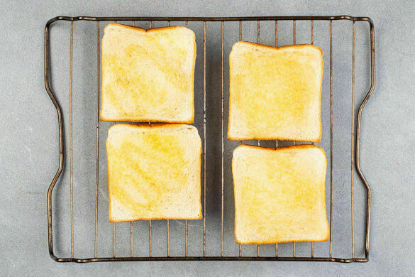 Die Toastscheiben mit insgesamt 2EL Olivenöl oder Butter bestreichen und auf einem Backrost über dem Gemüse im Ofen in 6–8Min. goldbraun und knusprig backen.