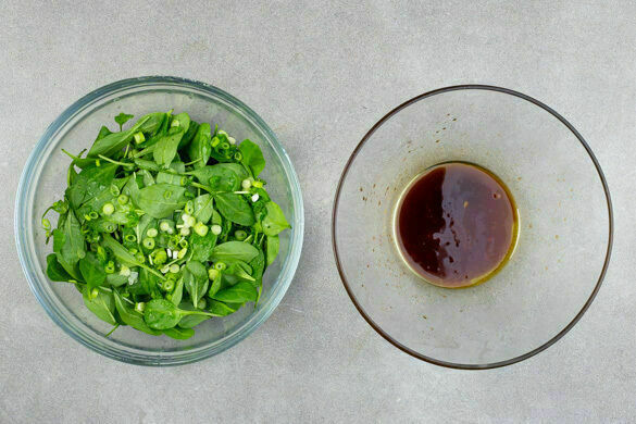 Die Lauchzwiebeln in feine Ringe schneiden. Die Sojasauce mit 1EL Olivenöl, 1EL hellem Essig und 1TL Zucker verrühren. Das Dressing mit dem Spinat und den Lauchzwiebeln zu einem Salat vermengen.