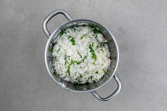 Den Reis in einem Sieb kalt abspülen, bis das Wasser klar bleibt. Sobald das Wasser kocht, den Reis hineingeben und abgedeckt bei niedrigster Hitze 12–14Min. kochen, bis das Wasser aufgesogen und der Reis gar ist. Noch ca. 5Min. ohne Hitzezufuhr ziehen lassen.