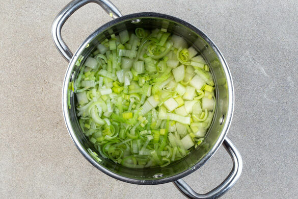 Den Kohlrabi in das kochende Wasser geben und ca. 2Min. kochen. Den Lauch dazugeben und ca. 1Min. im Wasser zusammenfallen lassen. Das Gemüse in ein Sieb abgießen, den Topf aufbewahren.