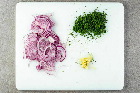 Den Knoblauch schälen und fein würfeln. Den Dill samt Stängeln fein schneiden. Die Zwiebeln schälen, halbieren und in feine Streifen schneiden.