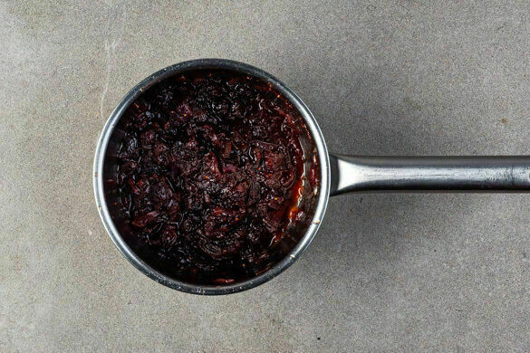 Die Zwiebeln in einem kleinen Topf mit 2EL Olivenöl und eine kräftige Prise Salz bei mittlerer Hitze 1–2Min. glasig andünsten. Die Cranberrys, 1EL Zucker, 1EL Essig und 300ml Wasser hinzufügen und ca. 15Min. köcheln lassen, bis der Dip eingedickt ist. Mit einem Stabmixer grob pürieren.