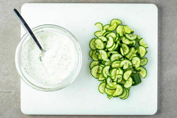 Die Meerrettichwurzel schälen und fein reiben. 2–3TL Meerrettich mit der sauren Sahne, dem restlichen Dill, 1EL hellem Essig, 1TL Salz und 1 kräftigen Prise Pfeffer vermengen. Die Gurke längs halbieren und in dünne Scheiben schneiden.