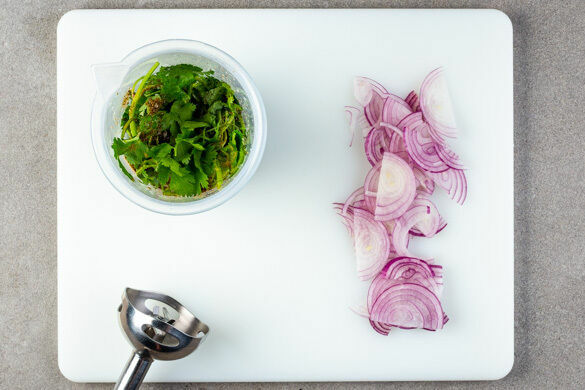 Den Backofen auf 220°C (200°C Umluft) vorheizen. Den Koriander grob schneiden und mit der Gewürzmischung, 3EL Pflanzenöl, 1EL Essig, ½TL Salz und je 1 Prise Zucker und Pfeffer in einem hohen Gefäß mit einem Stabmixer zu einer Gewürzpaste pürieren. Die Zwiebel schälen, halbieren und in feine Streifen schneiden. Den Teig mit dem Papier nach unten vertikal ausrollen.
