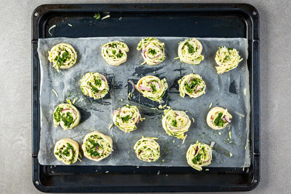 Die Gewürzpaste auf dem Teig verteilen, dabei an der oberen Seite einen ca. 2cm breiten Rand frei lassen. Den Teig mit dem Käse, den Zwiebeln und je 1 Prise Salz und Pfeffer bestreuen und von unten nach oben eng aufrollen. Die Pizzarolle in 16 gleich große Stücke teilen und mit dem Papier auf einem Backblech in 15–20Min. im Ofen goldbraun backen.