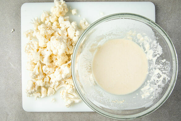 Eine große Pfanne ca. 1,5cm hoch mit Pflanzenöl befüllen und bei starker Hitze erwärmen. Die Stärke mit 65g Mehl, ½TL Salz und 90ml Wasser verrühren. Den Blumenkohl in 2–3cm große Röschen schneiden und mit dem Teig vermengen. Um zu testen, ob das Öl heiß genug ist, ein Blumenkohlröschen hineingeben. Ist das Öl heiß genug, wird es sofort sprudeln.