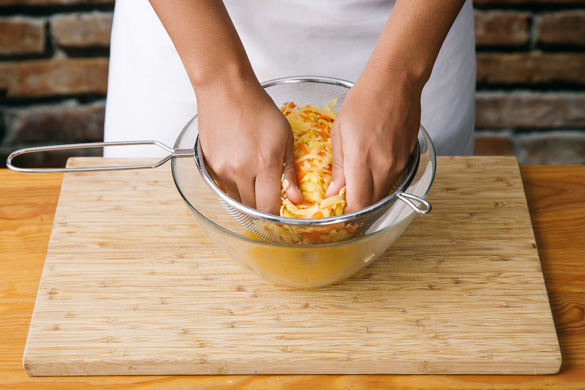 Den Kartoffelmix sehr gut durch ein Sieb auswringen, dann mit 1EL Olivenöl und etwas Pfeffer mischen.